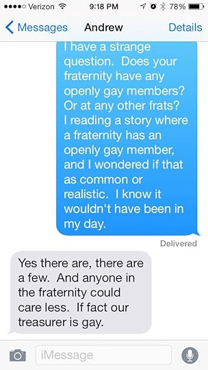 Reading this story prompted this convo with my college age son: He went on to say that it's really a different generation. Besides making me feel old as rocks, it made me really happy. And it made me enjoy this 'crushing on you' story all the more. It was playful, sexy and reminded me that fraternities don't have to be all about horrible homophobic hazing.