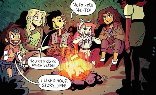While I'm still enjoying this graphic novel series, this volume still fell a tad flat for me. First of all, there is a change in art and graphic design and I really liked the original versions much better. Second, I don't know that the story flowed that well for me. Usually in graphic novels, since they are collections of single issues, each "chapter" flows into the other. I didn't get quite the feeling of cohesiveness on this one. That being said, I did enjoy the story line which centered around "bear woman" and how it opened with all the girls hanging out around the campfire telling scary (not so scary) ghost stories. It made for some really fun illustrations.