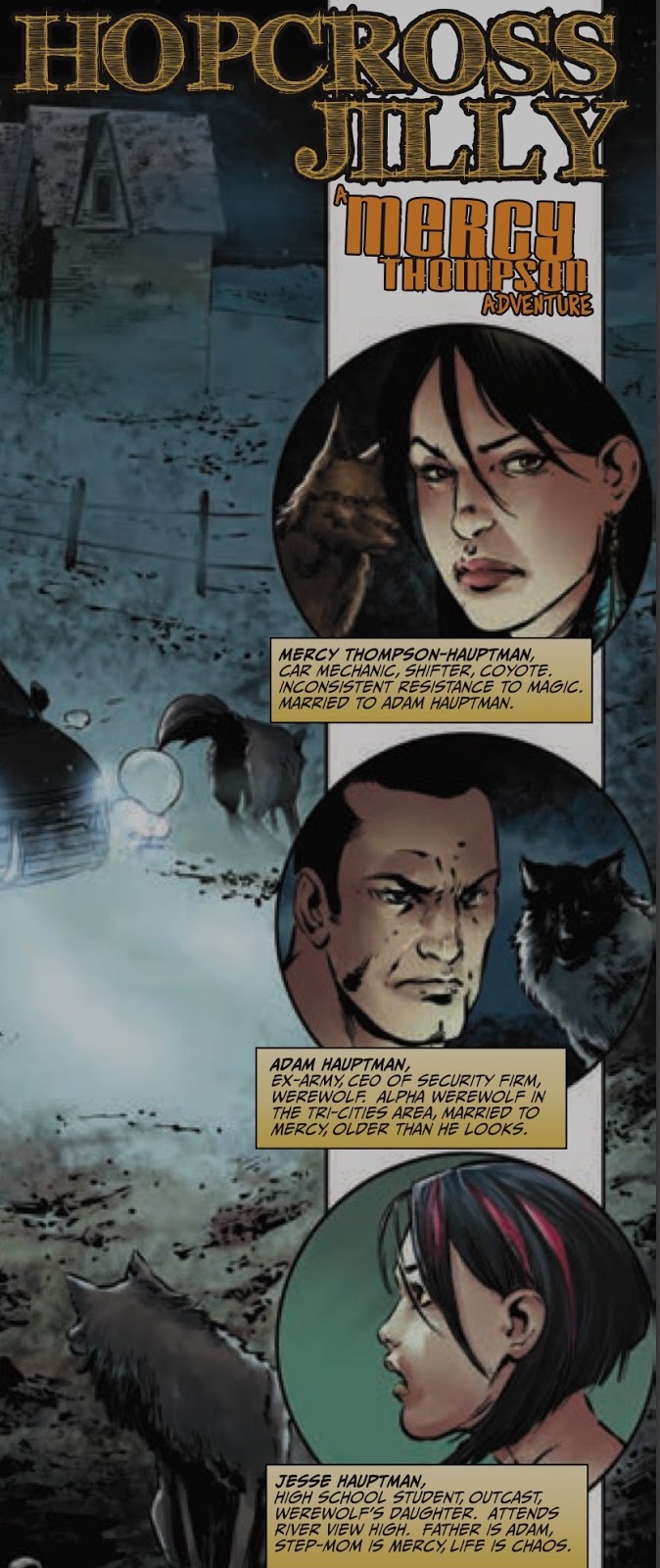 Hopcross Jilly was a fun read and, in my opinion, another great addition to the Mercyverse. This particular adventure takes place between Frost Burned (book 7) and Night Broken (book 8) and just after the events in Dead Heat (book 4 in the Alpha & Omega series). If you were to pick up this graphic novel without ever having read the Mercy books you would still be able to follow the story without any major issues. Here's the gist of what happens: Mercy, Adam and crew head out for an evening stroll, they find several buried bones, they get involved in the investigation, Jesse (Adam's daughter) ends up getting dragged into the mess, craziness ensues and the problem gets handled.