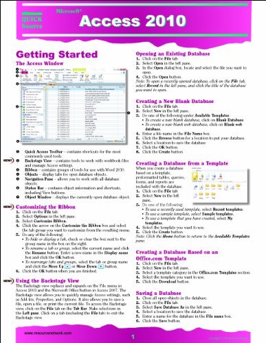 Do you need an easy-to-follow software reference right at your fingertips? Our 6 page, tri-fold guides are the answer. These quick reference guides include step by step instructions to help users to learn software features more quickly, as well as full color screen graphics to highlight important features. Quick Source reference guides also include the software program s NEW features and give you quick access to time saving shortcuts. The Access 2010 Quick Source Guide is a clear and concise tool for learning the features in Access 2010. Features contained in this guide include features such Customizing the Ribbon NEW!, Using the Backstage View NEW, Working with Database Objects, Creating Forms, Using Conditional Formatting NEW!, Editing Relationships, Exporting Database Objects, and much, much more!