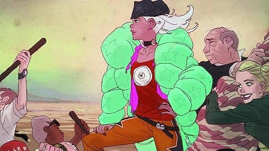 It's quick wit, satire, and Easter Eggs, as well as strong and independent female lead, remind me no less of Tank Girl. Mark Russell is officially a genius, and Ben Caldwell's illustrations and Mark Morales' colors are the gorgeous icing on the funny cake. I won't summarize at all so you can enjoy discovering this on your own. But first, just a few favorite quotes (there were so many I couldn't write down the entire book):