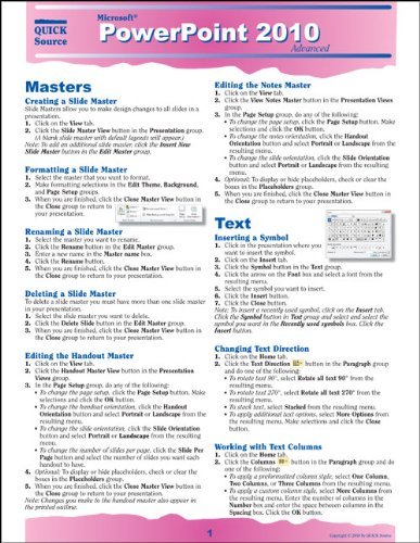 Do you need an easy-to-follow software reference right at your fingertips? Our 6 page, tri-fold guides are the answer. These quick reference guides include step by step instructions to help users to learn software features more quickly, as well as full color screen graphics to highlight important features. Quick Source reference guides also include the software programs NEW features and give you quick access to time saving shortcuts. The PowerPoint 2010 Advanced Quick Source guide is a clear and concise tool for learning the advanced features in PowerPoint 2010. Features contained in this guide include features such Creating a Slide Master, Working with Text Columns, Ordering Objects, Formatting Text, Converting an Image to a SmartArt Graphic, Creating a Custom Slide Show, Setting Up a Presentation to Run Automatically, Using the Mini Translator, and much, much more!