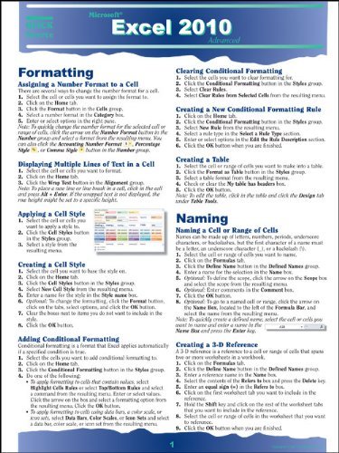 Do you need an easy-to-follow software reference right at your fingertips? Our 6 page, tri-fold guides are the answer. These quick reference guides include step by step instructions to help users to learn software features more quickly, as well as full color screen graphics to highlight important features. Quick Source reference guides also include the software program s NEW features and give you quick access to time saving shortcuts. The Excel 2010 Advanced Quick Source Guide is a clear and concise tool for learning the features in Excel 2010. Features contained in this guide include features such Adding Conditional Formatting, Creating a 3-D Reference, Creating a Drop-Down List, Using Goal Seek, Importing Data from a Web Page, Understanding Formula Errors, Creating a Slicer, and much, much more!