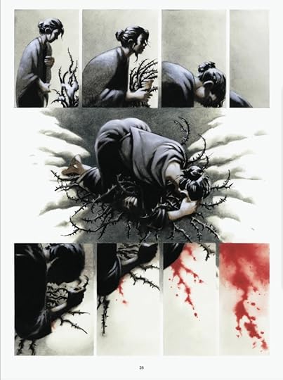 Night tells her to go into the forest, but first the mother must sing every lullaby that she has ever sung for her child. In the forest, a thorn bush tells her which way to continue, but only after she has warmed the bush by pressing it to her chest, causing her to bleed. The mother then reaches a lake that carries her across in exchange for her eyes, which she cries out.
