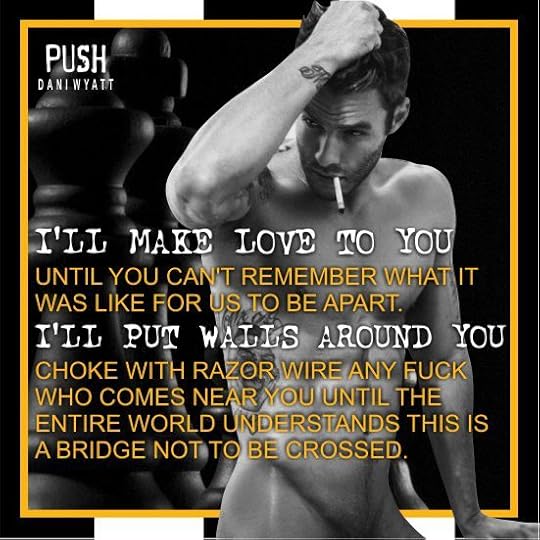 What an awesome book! I consumed Push in one sitting. This was a roller coaster of emotions, hot passion embraced with sweetness and angst combined. This is my first book from Dani Wyatt , but after reading this 5 star-read, it will definitely not be my last.