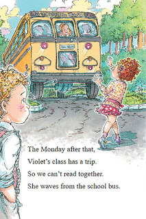 But there's a period of a few weeks where they just can't seem to connect for their Monday reading sessions. First, Nancy wakes up with a cold and can't go to school. The next week, Violet's class has a field trip. The week after that, it's a holiday and there's no school. Nancy really misses her reading buddy... but with a bit of string-pulling from the parents behind the scenes, the girls eventually find a way to have some reading fun together.