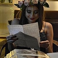 “The scene of a strange woman holding a little white umbrella under the rain, playing with his dog, laughing.”