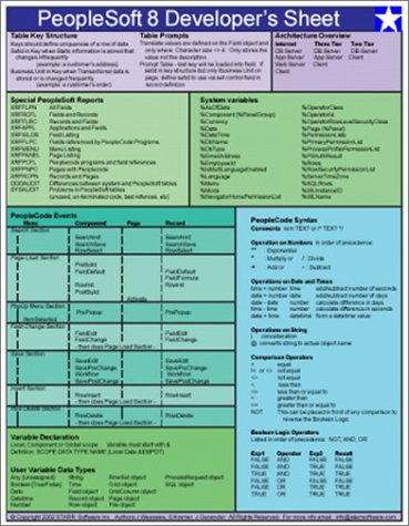 The front covers Table structure, Prompts, Special PeopleSoft Report, System Variables, PeopleCode Events, PeopleCode Syntax and Variable information.