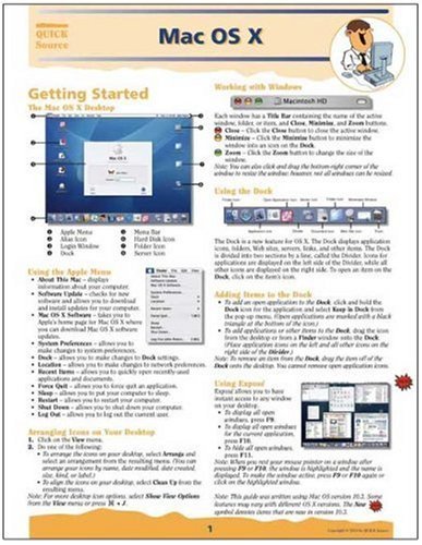 Do you need an easy-to-follow software reference right at your fingertips? Our 6 page, tri-fold guides are the answer. These quick reference guides include step by step instructions to help users to learn software features more quickly, as well as full color screen graphics to highlight important features. Quick Source reference guides also include the software program s NEW features and gives you quick access to time saving shortcuts. The Mac OS X Quick Source guide is a clear and concise tool for learning the features in Mac OS X. Features contained in this guide include NEW features such as Enabling Fast User Switching, Changing User without Logging Off, and Using Secure Empty Trash. It also includes Using the Apple Menu, Working with Windows, Using Finer, Starting an Application, Adding a New Account, Opening a Folder, Opening a Document, Connecting to a Network Server, Working with Fonts, Locking and Unlocking Items, Setting Dock Preferences, Logging Out, and much more.