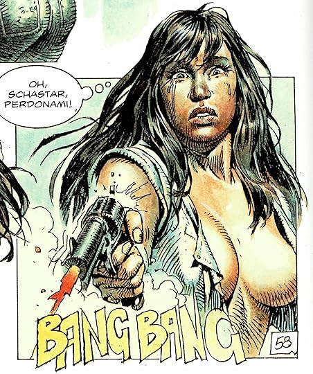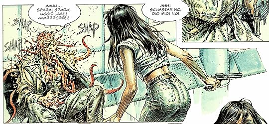The art is absolutely gorgeous - and I'm not just referring to Serpieri's loving depictions of the heroine in varying states of undress and often disturbing sexual situations. A clear influence can be seen from the used futures, desolate landscapes and worn-down junky spaceships filtered through the 70's acidhead mysticism of Jean "Moebius" Giraud but much darker and grittier. (I guess that's the difference between the 1970's and the 1980's in a nutshell) The story, on the other hand, feels very randomly thrown together with a new plot twist seemingly out of the blue every 20 pages every time Serpieri gets the idea for another sexual fetish to depict, a new action scene or disgusting mutants to draw in detail.