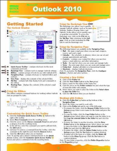 Do you need an easy-to-follow software reference right at your fingertips? Our six page, tri-fold guides are the answer. These quick reference guides include step by step instructions to help users to learn software features more quickly, as well as full color screen graphics to highlight important features. Quick Source reference guides also include the software program s NEW features and gives you quick access to time saving shortcuts. The Outlook 2010 Quick Source guide is a clear and concise tool for learning the features in Outlook. This guide include tips and instructions on many topics, including Working with the Ribbon, Using Quick Steps, and Working with Conversation View. It also includes Using Backstage View, Working with the People Pane, Inserting a Screenshot, and Creating a Calendar Group!