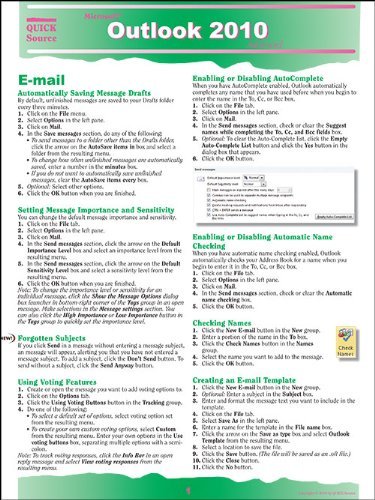 Do you need an easy-to-follow software reference right at your fingertips? Our 6 page, tri-fold guides are the answer. These quick reference guides include step by step instructions to help users to learn software features more quickly, as well as full color screen graphics to highlight important features. Quick Source reference guides also include the software program s NEW features and give you quick access to time saving shortcuts. The Outlook 2010 Advanced Quick Source guide is a clear and concise tool for learning the Advanced features in Outlook 2010. Features contained in this guide include features such as: Setting Message Importance, Creating an E-mail Template, Adding a Theme, Using the Mini Translator NEW!, Creating a Search Folder, Managing Rules, Creating a New Data File, and much, much more!