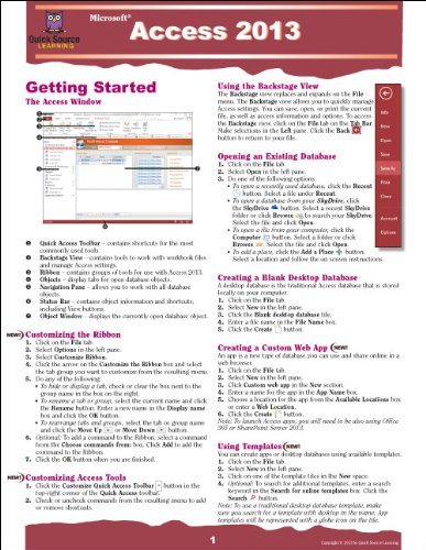 Do you need an easy-to-follow software reference right at your fingertips? Our 6 page, tri-fold guides are the answer. These quick reference guides include step by step instructions to help users to learn software features more quickly, as well as full color screen graphics to highlight important features. Quick Source reference guides also include the software program s NEW features and gives you quick access to time saving shortcuts. The Access 2013 Quick Source guide is a clear and concise tool for learning the features in Access. This guide include tips and instructions on many topics, including Creating a Custom Web App, Using Templates, and Designing a Form. It also includes Setting Field Properties, Designing a Query, Launching an App, Using the Action Bar, and Backing Up a Database!