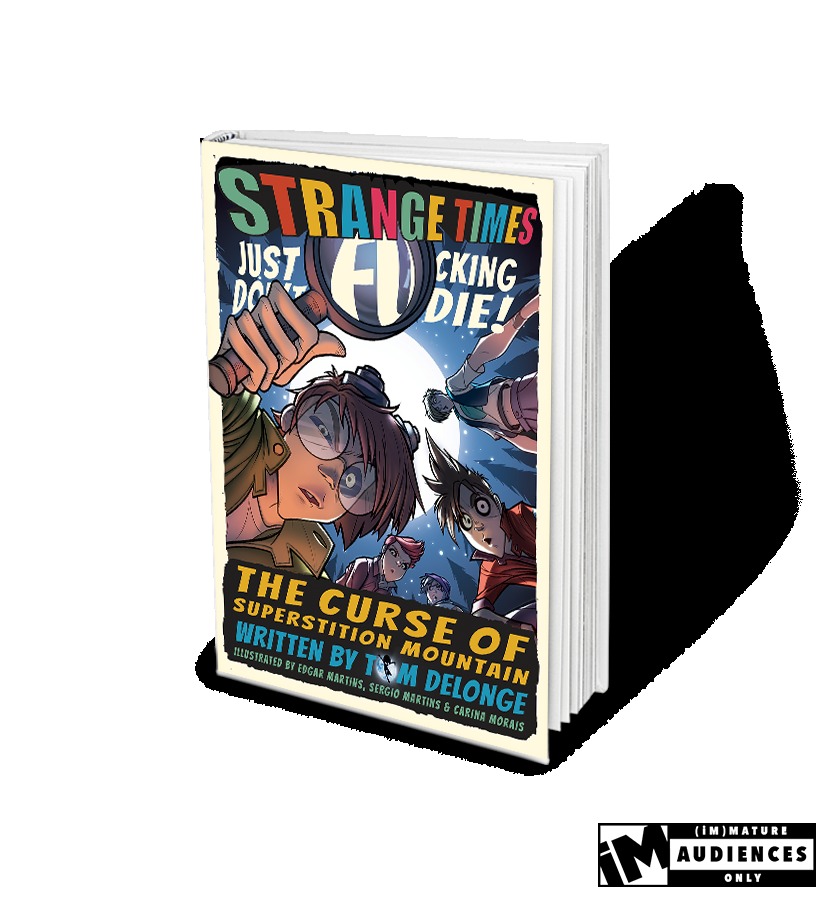 The highly anticipated debut of the investigative adventures of the Strange Times crew written by Tom DeLonge! The Curse of Superstition Mountain Don't F**king Die is a 28 page full color, hardcover book that follows Charlie, Mettheson, Wiz, Riley and Mouse as they locate and document paranormal activity. With plenty of profanity, mom jokes and urine, this title is intended for (iM)Mature audiences only.