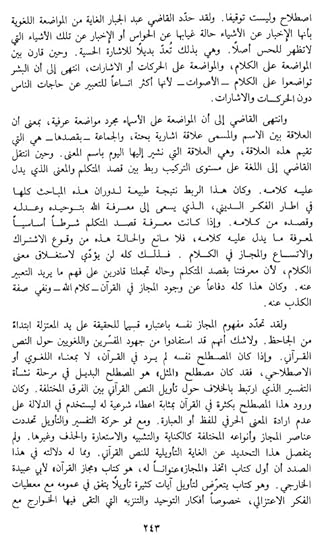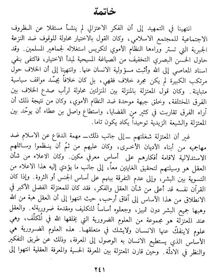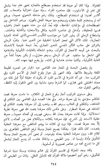 (ولقد وجد المعتزلة في تقسيم القرآن الكريم إلي محكم ومتشابه وسيلة دينية شرعية للتأويل، رغم أنهم أخضعوا دلالة القرآن كله للدليل العقلي. وكان من الطبيعي أن تكون الآيات التي تسند وجهة نظرهم وأفكارهم العقلية محكمة، وأن تكون تلك التي يستدل بها خصومهم متشابهه في حاجة للتأويل. وسلك خصوم المعتزلة نفس مسلكهم. وكان القول بالمجاز عند كليهما وسيلة للتأويل وأخراج النص عن ظاهره. وحين يعجز المعتزلة عن تأويل النص استناداً إلي تركيبه اللغوي، يلجأون إلي الاستناد إلي الدليل العقلي . وكلا الدليلين عندهم سواء في تأويل النص القرآني. وقد اتضح ذلك في تأويل الآيات التي تتصل بقضيتي رؤية الله وخلق الأفعال. -وأياً كان تقويمنا لجهود المعتزلة، فالذي لا شك فيه أنهم حاولوا مخلصين رفع التناقض بين العقل والشرع من جانب، وبين النصوص المتعارضة ظاهريا في القرآن من جانب آخر. وكانت جهودهم في مجالات المعرفة واللغة والمجاز- لخدمة هذه المهمة- انجازاً له آثاره العديدة على هذه المجالات، وعلى المتخصيين فيها في تراثنا العربي. ولعل هذه الدراسة أن تكون تمهيداً لرصد هذه التأثيرات التي تركها المعتزلة في غيرهم من أعلام الثقافة العربية وعلومها.)