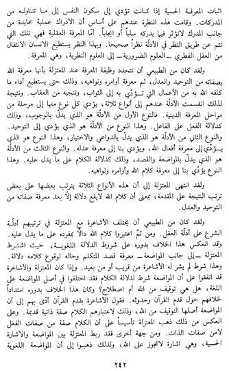 الدكتور نصر في الكتاب يطرح مقدمة بسيطة عن الأفكار الأساسية للمعتزلة و يحاول شرح الاختلافات الفكرية في بعض القضايا الحيوية بين المعتزلة و بين مخالفيهم.. الملاحظ هنا هو وجود "نسق فكري شبه متكامل" لدي كل جهة و هذا النسق الفكري كان متطورا متجددا... فكانت كل فكرة يتبعها رد من جماعة أخرى يتبعها تغيير في شكل الفكرة الأصلي يتبعها ظهور فكرة جديدة.. و هكذا في علاقة دياليكتية حية جعلت كل جماعة فكرية لا يتوقف فكرها عند نقطة معينة بل يتغير بإطراد مع مرور الزمن..