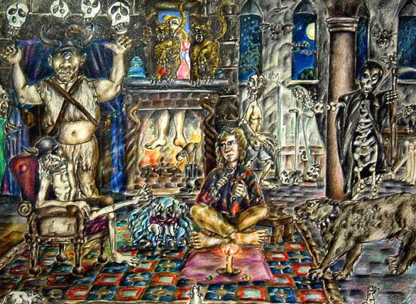 The boy spends 3 nights in the castle where he is greeted by demon cats and dogs and dead dudes and ghosts and ghouls. And still the boy doesn't know how to shudder but is rather baffled to why these spooks aren't doing logical stuff like sitting by the fire and getting warm.
