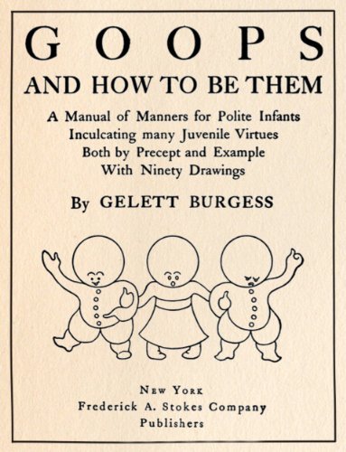 "Goops and How to be Them" is a classic children's book first published in 1900 by Gelett Burgess as "a manual of manners for polite infants inculcating many juvenile virtues both by precept and example with ninety drawings."The book is full of good advice for the young reader on topics as diverse as table manners, bed time, politeness, and patience. It's also clearly a product of the early 20th century with some instruction no longer current (or even appropriate!). Still, its good humor, witty poems, and whimsical illustrations make the book a timeless classic for children and adults alike.- 90 illustrated pages- 40 rhyming poems- Set on a supple paper background for an authentic feelThis Kindle version of "Goops and How to be Them" has been carefully designed by hand from scans from the original book and set against a paper background to simulate the original as much as possible.Topics Table Manners - 1- Table Manners - 2- Cleanliness- Neatness- Generosity- Consideration- Miss Manners- Borrowing- Memory- Books- Honesty- "Why?"- Bed-Time- Modesty- Disfiguration- Bravery- Tidiness- Patience- Fortitude- George Adolphus- Politeness- Gentleness- Hospitality- Pets- Remember!- Curiosity- Willy- Clothes- Helpfulness- Quietness- Order- Teasing- Interruption- Cry-Baby- Caution- Tardiness- Obedience- Church Headaches- Perseverance- Doll-Time- Combing and Curling- Cheerfulness