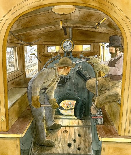 And now finally, while I personally have read Locomotive as a Kindle download, as my local library had a simply massively long waiting list (and it would likely have taken months for Locomotive to have become available), I certainly do NOT AT ALL suggest reading this as en e-book (for while the illustrations have survived the transfer of Locomotive to a Kindle format well enough and generally intact, the words, the printed text, they are so minuscule that reading with any kind of comfort even wearing glasses has been pretty well impossible). Two and a half stars, grudgingly rounded up to three stars, as even with my issues concerning the narrative of Locomotive, I have truly loved the illustrations (but while much of the presented text is readable and engaging, what has not been stated, what has been left out by Brian Floca, really does make me cringe and leaves rather a bit to be desired, as with a book on trains published in the 21st century, surely the author can and should be more inclusive and realise that while the construction and use of railroads in the USA was a boon to many and definitely progress, it also had a nasty undercurrent that really should never be forgotten, that must be remembered).