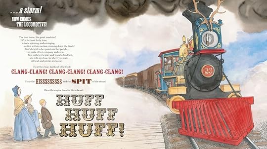 As a narrative in and of itself, Brian Floca's Locomotive for all intents and purposes and in general does present and depict a truly wonderful and expressive marriage of text and images (and is thus also and certainly a more than worthy recipient of the 2014 Caldecott Medal), glowingly and intensely, engagingly showing the excitement and eager anticipation of the first transcontinental USA railways, of finally being able to travel in relative comfort and ease by train across the vast stretches of the American landscape, which previously one could only do and achieve with and by covered wagons, stagecoaches, on horseback, and yes, even via ship going all the way around the tip of South America to reach the West Coast of the United States from the East Coast. And as a fan of onomatopoeic texts and verses, I really do so much love love love how the sounds of the locomotive, its hissing, spitting, the black smoke it emits are rendered by author/illustrator Brian Floca not only visually (illustratively) but also textually, how pictures and words both compliment and complement each other (and how sometimes, the illustrations even expand on the narrative with little added touches, such as for example, the shying horse that dumps its rider and takes off in fear as the locomotive approaches, a much understandable equine reaction in fact, as horses are notoriously easy to spook, and the locomotives of the past supposedly truly were generally described as loudly hissing entities, as gigantic beings of noise and might).