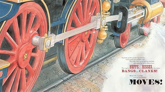 This has to be one of the best books on trains, ever! Although it is a "picture book" the simple, basic, clear explanations and illustrations assist the 3 year old and the chick that has 60 years on that 3 year old! How the pistons work, what a "tender" is, the purpose of a sand dome (who knew???), and the purposes of all those bits and pieces creates an educational read that is a joy to open.