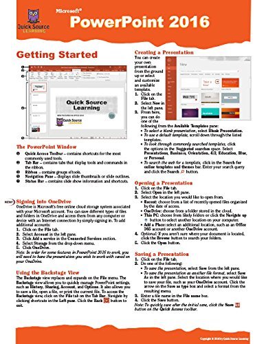 Do you need an easy-to-follow software reference right at your fingertips? Our 6 page, tri-fold guides are the answer. These easy guides include step by step instructions to help users to learn the software more quickly, as well as full color screen graphics to highlight important features. Quick Source reference guides also include the NEW features and give you quick access to time saving shortcuts. The PowerPoint 2016 Quick Source guide is a clear and concise tool for learning the features in PowerPoint. Features contained in this guide Signing into OneDrive, Inserting Excel Charts, Adding a Photo Album, Creating an Animation with Morph, Sharing a Presentation, Using Designer, Drawing in a Presentation and much, much more! If you would like to purchase a Quick Source Guide, but do not see the title you want, visit us at quicksourcelearning.com.