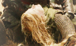 Out of the wreck rose the Black Rider, tall and threatening, towering above her. With a cry of hatred that stung the very ears like venom he let fall his mace. Her shield was shivered in many pieces, and her arm was broken; she stumbled to her knees. He bent over her like a cloud, and his eyes glittered; he raised his mace to kill.