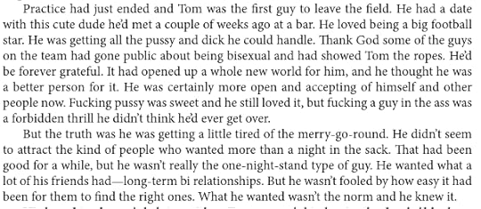 Tom stopped halfway to the table with his plate in hand. "I didn't think about that," he said slowly. "She knows I like guys, too." [...]