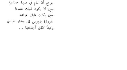 "موجع أن تنام في مدينة صناعية حين لا يكون قلبك مضحة حين يكون قلبك فراشة مغروزة بدبوس إلى جدار الفراق وعبثا تخفق أجنحتها"