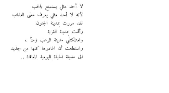 رغم ان الأبيات بها بعض المبالغة، لكني أحببت لغة غادة السمان و أسلوبها شديد الرقة و العذوبة الذى يترك أثراً في نفس كل من يقرأ كلماتها