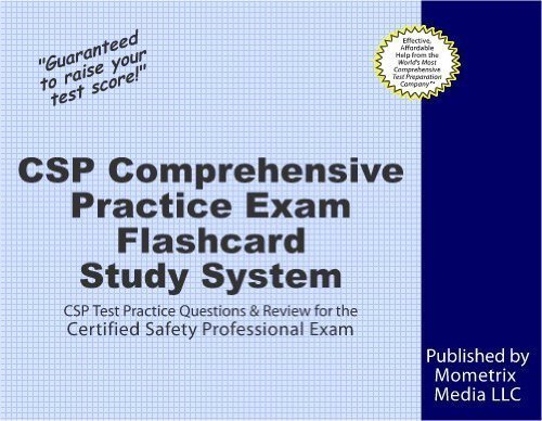 CSP Comprehensive Practice Exam Flashcard Study System uses repetitive methods of study to teach you how to break apart and quickly solve difficult test questions on the Certified Safety Professional Exam. Study after study has shown that spaced repetition is the most effective form of learning, and nothing beats flashcards when it comes to making repetitive learning fun and fast. Our flashcards enable you to study small, digestible bits of information that are easy to learn and give you exposure to the different question types and concepts. CSP Comprehensive Practice Exam Flashcard Study System Hazardous Materials Spill, Storage of Hazardous Materials, NHTSA, Occupational Safety and Health Agency (OSHA), Heinrich's Pyramid Theory, William Haddon's Energy Theory, Safety Audit, Classes of Hazards, United States Code (USC), Department of Agriculture, NIST, Department of Health and Human Services, NIOSH, Bureau of Labor Statistics, Federal Emergency Management Agency (FEMA), Environmental Problems, Product Life Cycle, Fault Tree Analysis, Ventilation, Combustible Liquids, Tripping Hazards, Sound, Facility Development Process, Scattergram, Spearman Correlation Coefficient, Multiple Factor Theory, Privity, Risk, Training and Procedures, National Fire Protection Association (NFPA), Motivation Theories, Job Safety Analysis (JAS), Ergonomics, Anthropometry, Population Demographics, Airborne Contaminants, Toxicity, Pneumoconiosis, Henry's Law, Inspections, Accident investigations, Structural and Dynamic failure, Simulations, Judgment and Emotion, Biorhythms, Consumer Product Safety Commission (CPSC), Job Stress, Dalton's Law of Partial Pressures, Document Management, Evaluation, Code of Ethics, Professional Conduct, Control Charts, Pythagorean Theorem, Environmental Protection Agency (EPA), Critical Thinking, Hypoxia, Code of Federal Regulations (CFR), Computer Terms, Conflict Resolution, Arbitration and Mediation, and much more...