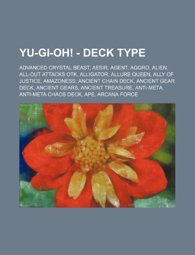 Source: Wikia. Pages: 216. Chapters: Advanced Crystal Beast, Aesir, Agent, Aggro, Alien, All-Out Attacks OTK, Alligator, Allure Queen, Ally of Justice, Amazoness, Ancient Chain Deck, Ancient Gear Deck, Ancient Gears, Ancient Treasure, Anti-Meta, Anti-Meta Chaos Deck, Ape, Arcana Force, Archfiend, Archfiend Deck, Archlord, Armory Arm OTK, Attribute Field, Attribute Spirit, B.E.S., Bad Reaction to Simochi Deck, Bad Reaction to Simochi OTK, Banish Psychic, Barrier Statue, Batteryman, Batteryman OTK, Bazoo Return, Beast, Beatdown Deck, Ben-Kei OTK, Billy Deck, Blackwing, Blackwing Twilight, Blue-Eyes, Bounce Deck, Bugroth, Burn Deck, Burning Skull, Butterfly Dagger - Elma OTK, Chaos, Chaos Dragon Deck, Chaos End Dragon Deck, Charmer, Chimeratech OTK, Chrysalis, City Deck, Clear, Cloudian, Clown Control, Colossal Fighter OTK, Cosmic Synchro Monster, Counter Burn Deck, Counter Fairy, Counter Fairy Deck, Crystal Beast Deck, Cup, Cy-Caliber, Cyber, Cyber-Stein OTK, Cyber Dragon OTK, Cyber Dragons, Cyber Girl, Cyber Style, Cyberdark, Cycler, Dark Armed Return, Dark Counter Deck, Dark Creator Return, Dark Lucius, Dark Magician of Chaos OTK, Dark Scorpion, Dark Scorpions Deck, Dark Simorgh Deck, Dark World, Dark counterpart, Darklord, Debris-Hime, Demise OTK, Destiny Board Deck, Destiny HERO, Destiny Hero Deck, Diamond Dude Turbo, Different Dimension, Dimensional Eatos, Dimensional Virus Deck, Dinosaur, Disaster Dragon, Diva Zero, Dizzy, Double Aesir Deck, Dragon Lockdown, Dragon Lord, Dragunity, Dragunity Arma, Dragunity Knight, Earthbound Immortal Deck, Element, Elemental Hero Deck, Elf, Empty Jar, Equip Cat, Evil HERO, Evil HERO Dark Gaia OTK, Evol, Exchange of the Spirit OTK, Fairy, Field Searcher, Fiend Deck, Final Countdown Deck, Fire Burn, Flamesworn, Fleur, Flip Effect Deck, Fortune Fairy, Fortune Lady, Fossil, Four Elements, Frog Burn FTK, Frog Monarch, Gadget, Gadget Deck, Gadjiltron, Gagagigo, Gaia Knight, Gear Golem Rush, Gearfried, Geartown Turbo, Gem, Generat...