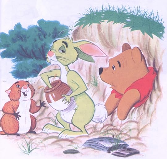 The story is a lot more disturbing than I would expect. I am confused about Rabbit saying, "NO!" both when Pooh asks if he's home and if he's Rabbit, respectively. But on the next page, he's all: "Oh, what a pleasant surprise, care for some lunch?" No sarcasm can be gleaned from the text or the picture; it's bizarre.