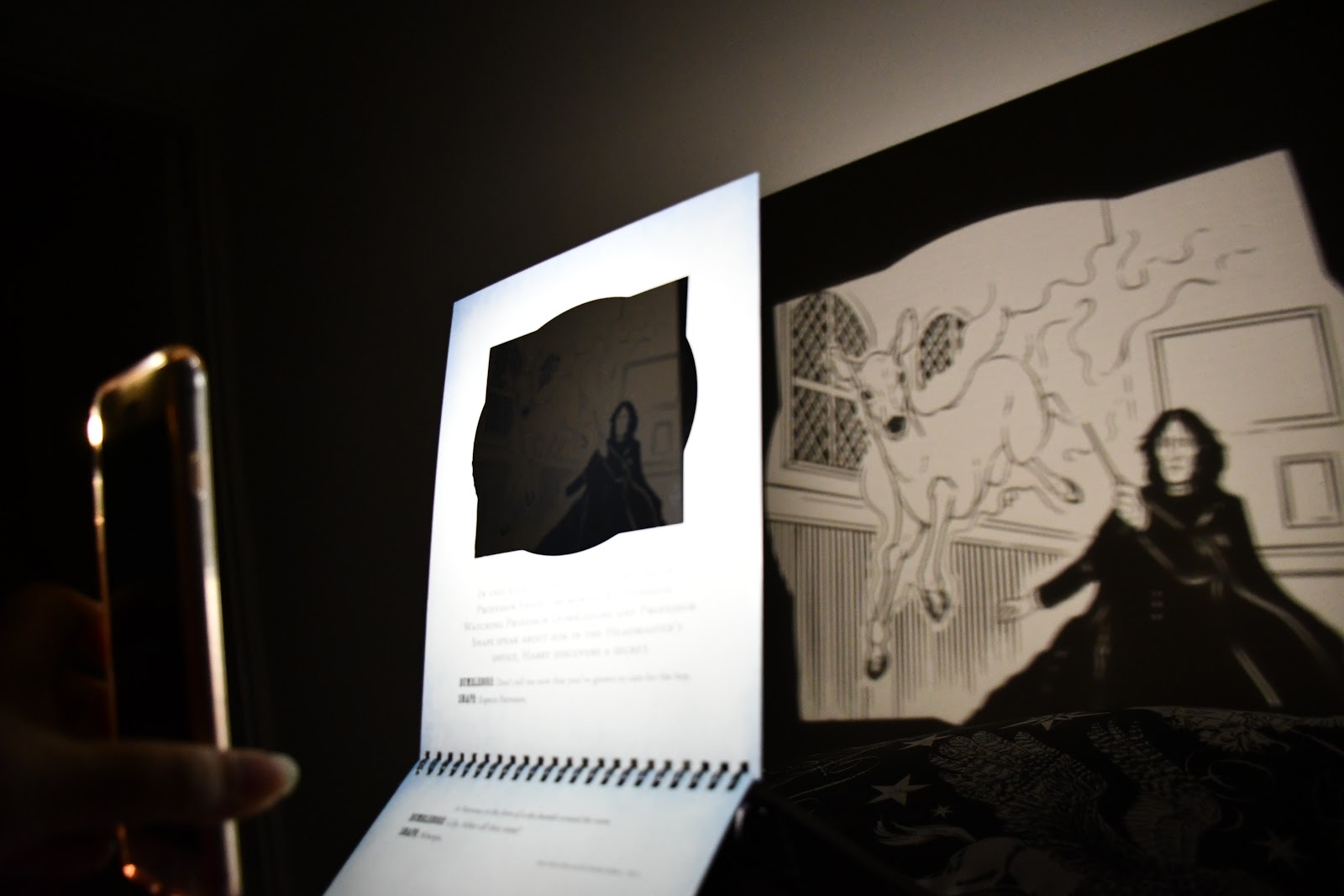Pages transparentes à éclairer avec une lampe de poche pour projeter au mur. Extraits des livres concernant le patronus. Possibilité de dessiner son propre patronus sur une page transparente à la fin pour l'éclairer ensuite.
