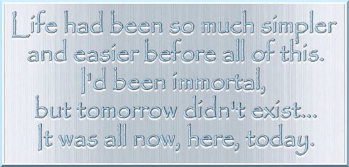 “Death was a stone, dragging me deep. Life had been so much simpler and easier before all of this. I’d been immortal, but tomorrow didn’t exist.”