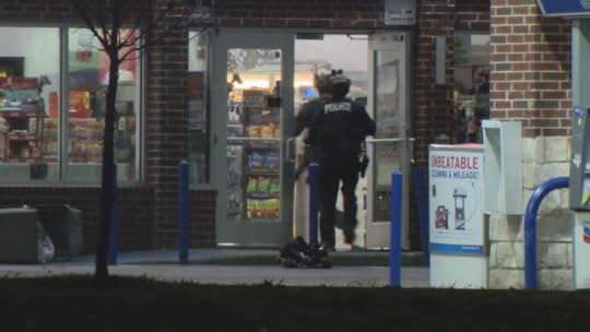 "Racks full of magazines filled the front glass wall; nothing could be seen of us below chest height. Above that line, the world was red, white, and blue.