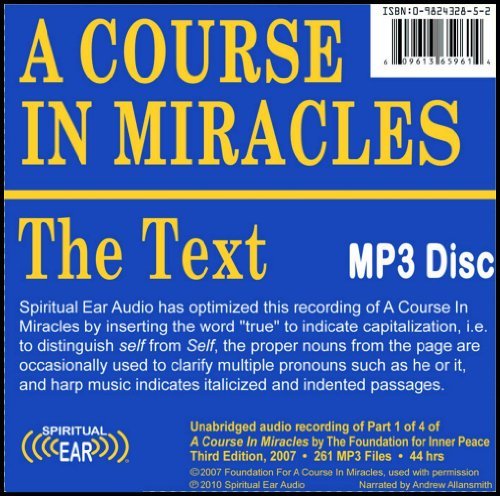 A Course In Miracles is likely the most powerful, clear, and thorough approach to enlightenment available for the western mind. This wonderful recording of this material is optimized for listening and comprehension. This recording is of The Text, Part 1 of 4 of A Course In Miracles 3rd Edition by the Foundation for Inner Peace and comprises 261 MP3 files with a 44 hour run time. These files are on a single DVD that will load on either a Mac or PC to your MP3 player, play directly on your computer, or play in your DVD player through your TV (be patient, loading takes time on your DVD player.) Listener Spiritual Ear carefully optimized this recording for listening by inserting the word TRUE to indicate capitalization, i.e. to distinguish self from Self; the proper nouns from the page are occasionally used to clarify pronouns such as he or it, and harp music indicates italicized and indented passages. This 2010 recording by Spiritual Ear Audio is read by Andrew Allansmith, a professional narrator and long-time student and teacher of A Course In Miracles. Andrew carefully reads this powerful work with engaging energy, well-placed emphasis, and much-welcomed pauses around the more powerful phrases. The reading style is gentle but lively and confident.