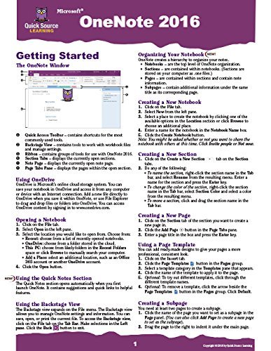 Do you need an easy-to-follow software reference right at your fingertips? Our 6 page, tri-fold guides are the answer. These easy guides include step by step instructions to help users to learn the software more quickly, as well as full color screen graphics to highlight important features. Quick Source reference guides also include the NEW features and give you quick access to time saving shortcuts. The OneNote 2016 Quick Source Reference guide is a clear and concise tool for learning the features in OneNote. Features contained in this guide Using the Quick Notes Section, Organizing Your Notebook, Handwriting Your Notes, Changing Handwriting to Text, Using Wiki-Style Links Within a Notebook, Tagging with the Tags Gallery, Sharing a Notebook, and much, much more! If you would like to purchase a Quick Source Guide, but do not see the title you want, visit us at quicksourcelearning.com.