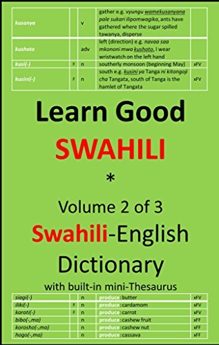Learn Good Swahili is presented in 3 Volume 1: A Complete Grammar. 349 pages. Volume 2: 6,000+ words Swahili-English Dictionary. 370 pages. Includes a built-in mini-thesaurus. *,**see examples below. Volume 3: 6,000+ words English-Swahili Dictionary. 427 pages. Includes a built-in mini-thesaurus. *,**see examples below. Volume 1 contains step-by-step explanations of all features of Swahili grammar, with lots of examples and exercises, plus indexes. For anyone new to Swahili or wants to improve or brush up - whether you are a tourist, an expatriate, a volunteer, etc in East Africa - these are the books you need to enhance your experience there, for being able to communicate with locals in their language is always most satisfying. All proceeds of this book will go to needy school children in Tanga, Tanzania where the author was born, grew up and finished high school. *An example of a dictionary entry: lingana v match e.g. kusoma kwa mtoto kunalingana umri wake, the child’s reading matches her age where "v" indicates verb. All Swahili text in all volumes is italicized as seen above, to visually distinguish it from all the other English text. **The built-in mini-thesaurus takes two forms: (1) Related Words e.g. the entry for "abadan" has Related Words, as ["F" = foreign-origin; "adv" = adverb] abadan F adv always e.g. yeye abadan haridhi, he is never contented Related baadaye, later/then daima, always halafu, then huenda, sometimes kabla ya, before kamwe, never kila mara, every time, always kisha, afterwards milele, forever punde, shortly sasa, now zamani, earlier (2) Words grouped under the following body, building structure, fauna, food, person, produce, terrain, tool, utensil, vegetation (including flora) and for adjectives, colours e.g. some of the entries under body are, in alphabetical order in [entries in brackets such as "(m,mi)" = (singular, plural prefixes); "n" = noun; "V", "xFF", "xFV", "U", "T" are noun groups as explained in Volume 1, Chapter 3: Nouns] mkono(m,mi) n arm V kwapa(-,ma) n armpit xFF mgongo(m,mi) n back