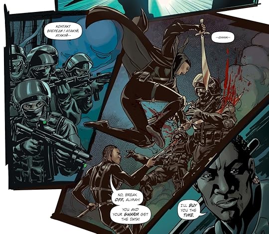 But then comes along this volume, and I wasn’t excited about it. It features four different stories, all with different artists (which doesn’t usually interest me) and four different co-writers, one for each take (same potential problem). But this is really what I have been waiting for, the serf stories, the potential for revolution, maybe! All the stories are relevant to the power issues that the very idea of an AI Lazarus explores, but from another angle, and then it turns out all four of the stories are related, too. Nifty writing by Lark and his team, and carefully planned out. I’d say this is heading in a promising direction toward a satisfying resolution.
