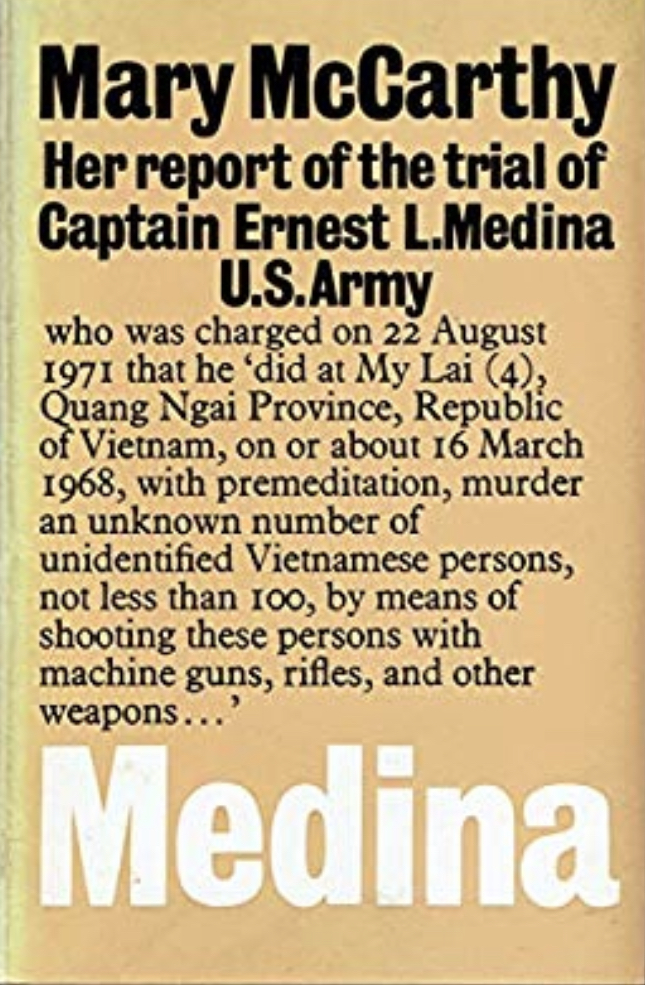 Medina by Mary McCarthy (Harcourt, Brace, Jovanovich, Inc. New York 1972)(343.73). This book is a record of and commentary on the court-martial trial of Captain Ernest Medina of the U.S. Army arising from the My Lai incident in Vietnam. Capt. Medina was the direct superior of Lieutenant William Calley and was on the ground with him at My Lai when approximately 400 unarmed Vietnamese men, women and children were rounded up and then butchered. Lieutenant Calley asserted that though the killings took place with his knowledge and under his command, he was only following a direct order from his superior officer Captain Medina. Medina denied giving such an order or having any knowledge of the event as it was occurring. Calley was convicted of murder at his court martial, but Medina was acquitted of any major crime. Was that justice? Was it fair? It was probably just as fair as anything else that occurred during the Vietnam conflict. My rating: 7/10, finished 2001.