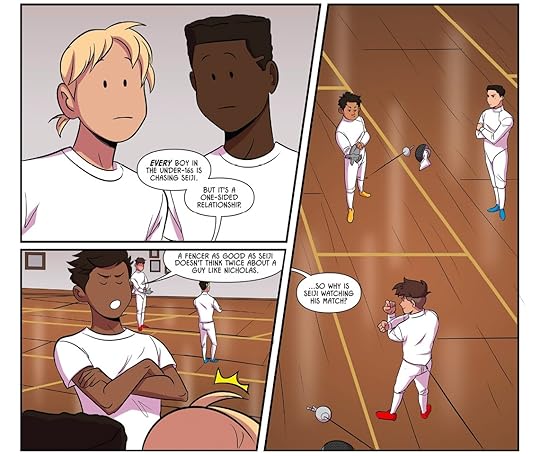 QUICK SUMMARY if you don't know these graphic novels are about these boys who go to this boarding school for Fencing and only three can make the team this year and one of the boys Seiji is like, a prodigy Fencer and this other boy Nicholas got totally beaten by him once and now he's determined to beat Seiji but also I hear it's gonna be a m/m romance and ITS JUST SO GOOD AND CUTE AND FUN AND I LOVE THE CHARACTERS