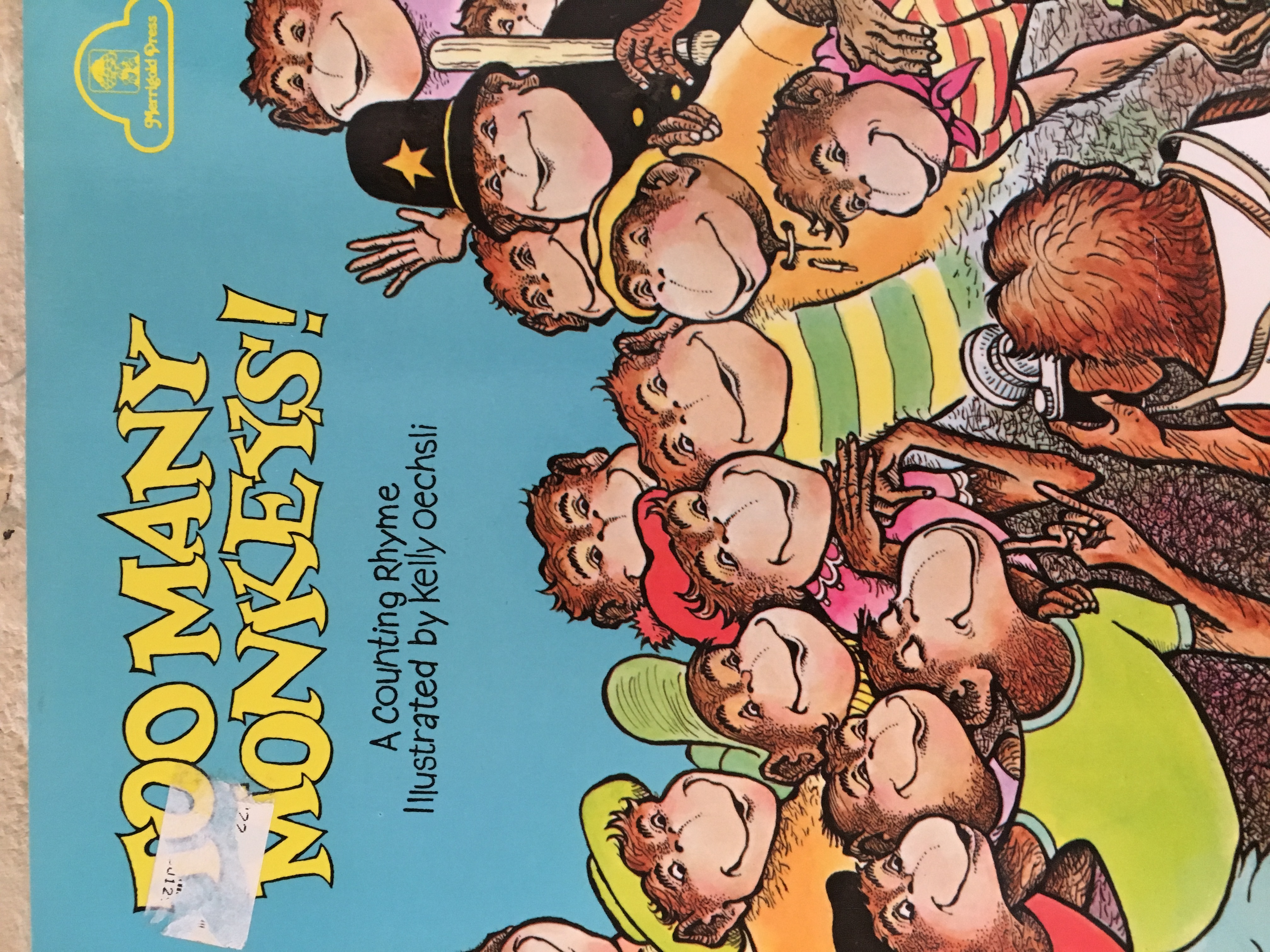Here is another familiar monkey story from my childhood! This book offered a fun way to learn about counting numbers from 1 to 10 and from 10 to 1. Each segment features monkeys doing fun activities, like climbing trees, knocking on doors, swinging and rowing boats. All told in a fun rhyming style. This book strikes the right balance between being educational and entertaining. You will always remember these funny monkeys. This is a counting book, so there are no spoilers here (laugh).