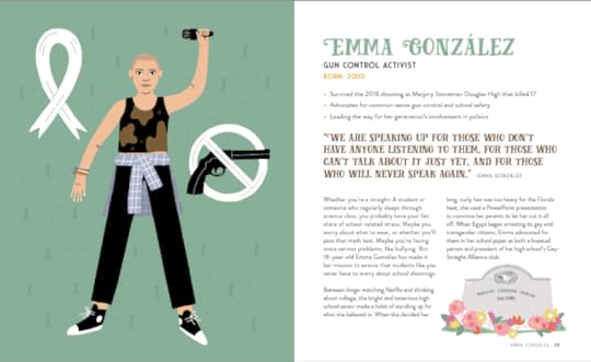 This ARC only included six chapters, so I can't speak to the entire work, but the sampling did give me an idea of the tone and aims of the book. The chapters, even the one on Emma Gonzales that discussed school shootings, all carry a bright, bouncy tone that sometimes veers into condescension.