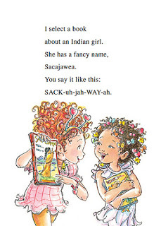 This Fancy Nancy title was a lesson in time management. Nancy picks a book on Sacajawea for her book report--she spends too much time on her cover and none on written report itself. Her teacher is kind-hearted and allows her to tell the class about the book.