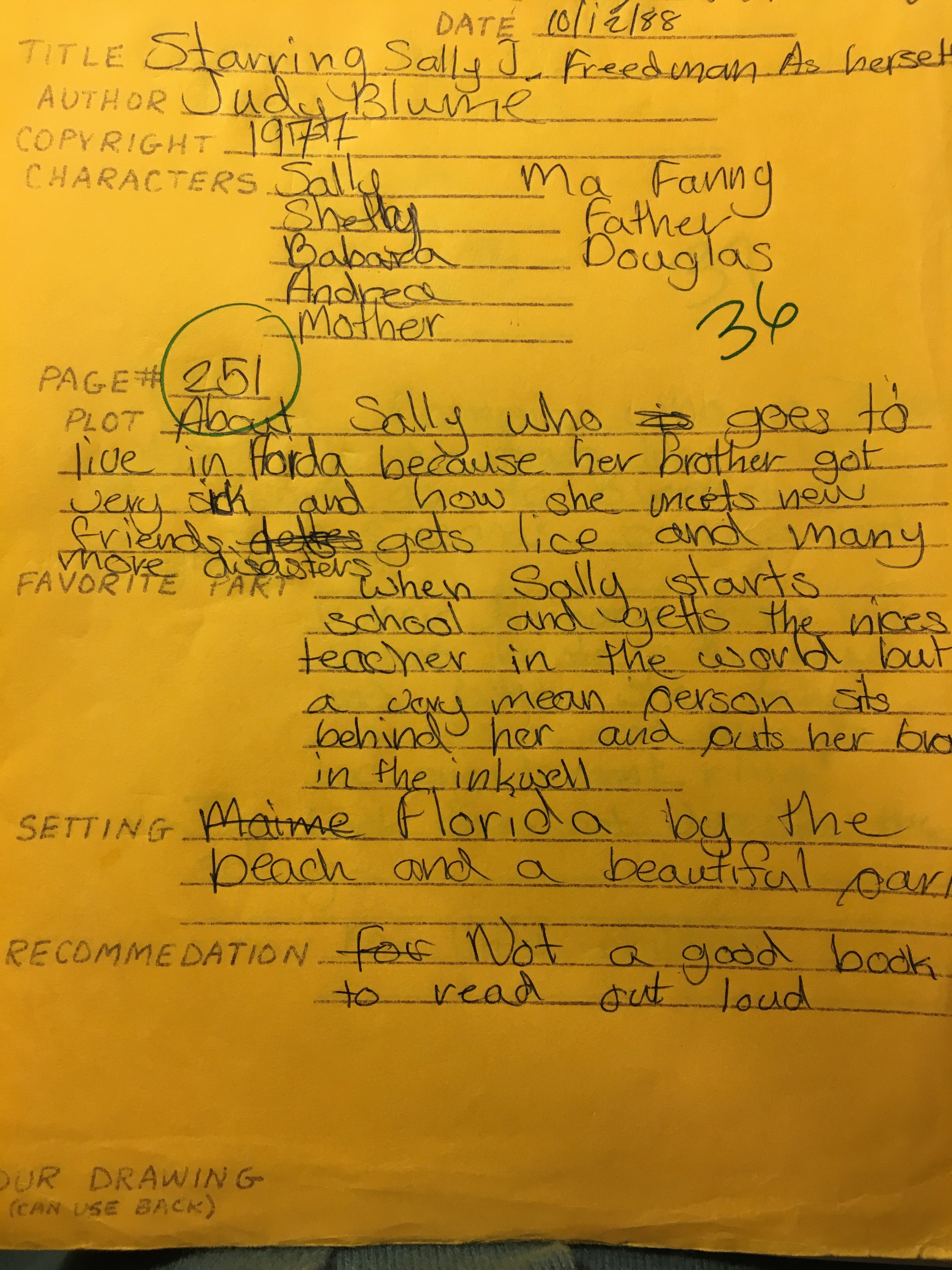 So my mother found a stack of book reviews I did in elementary school as part of my class competition for who could read the most books in one year. In her endless quest to clean out my paraphernalia from her house, they are now with me.