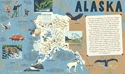 The book focuses on one region of the United States at a time, showing a blurb of each national park and where it's located on the map, and then features some of the more notable ones with a double-page spread of a larger illustration and summary, followed by another double-page spread with more details and tidbits about the park's interesting features, such as animals, plants, geologic formations, weather, Native American history, and more.