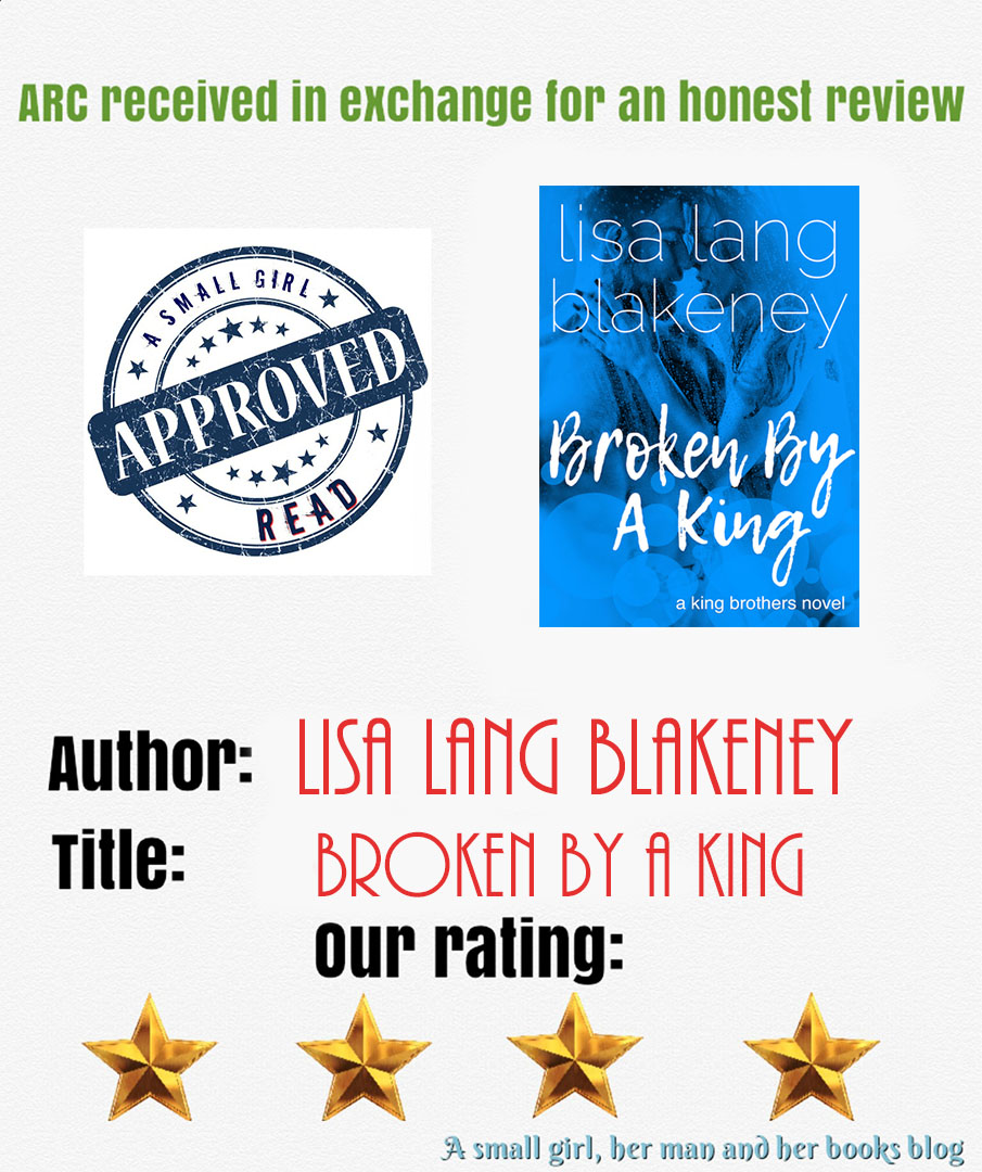 BROKEN BY A KING is book 3 in The King Brothers series by Lisa Lang Blakeney and it is Stone’s story. Michael /Stone is a soul that’s broken, who falls so hard for his mark- Ariana and he ends up feeling something deep and intense for her. Stone wants to be more than a broken shell of a man for this woman he has fallen deep for . Will Stone use her or will he be her savior? This was one steamy read, with angst, passion, heartbreak, and hot sizzling scenes. I loved the chemistry between Ariana and Stone. I do wish the ending wasn’t as rushed in the sense that we got to see more of how things were between the main characters –like how they were doing months down the road instead of just a few months later. I would like to know how things are. Otherwise, Stone’s story is one awesome romantic suspense read I have been eagerly waiting for that satisfies me and kept me going and hanging on the edge until the very end.