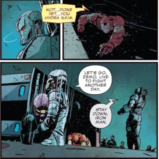 Last volume was mostly just watching Frank kill a bunch of bad people. It's kind of what we always see but this time he had one of the best weapons ever, War Machine! This volume starts off with the heroes trying to stop him. Not just one, or two, but a whole shit load. Luke Cage, Captain Marvel, Spider-man, The Thing, and more try to stop Frank from using the armor. Frank obviously wants to kill more people, and with ease, so he says "nah fuck that" and so the fight begins. Frank joined Hydra during Secret Empire, and he wants Zemo dead for tricking him, and he is now hunting his ass.