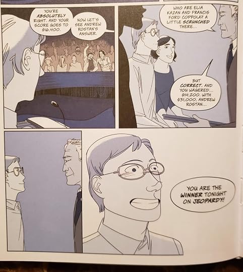 In this fabulous graphic novel memoir, author Andrew Rostan shares his obsession with Jeopardy. He had been an avid reader and trivia buff since first watching the game show with his Grandfather, who was also his best friend. Andrew is ostracized for being odd due to his quirky knowledge base, but did eventually achieve his dream of becoming a Jeopardy champion. This memoir is about so much more than just the game, chronicling Andrew's journey of self discovery as he reaches adulthood.